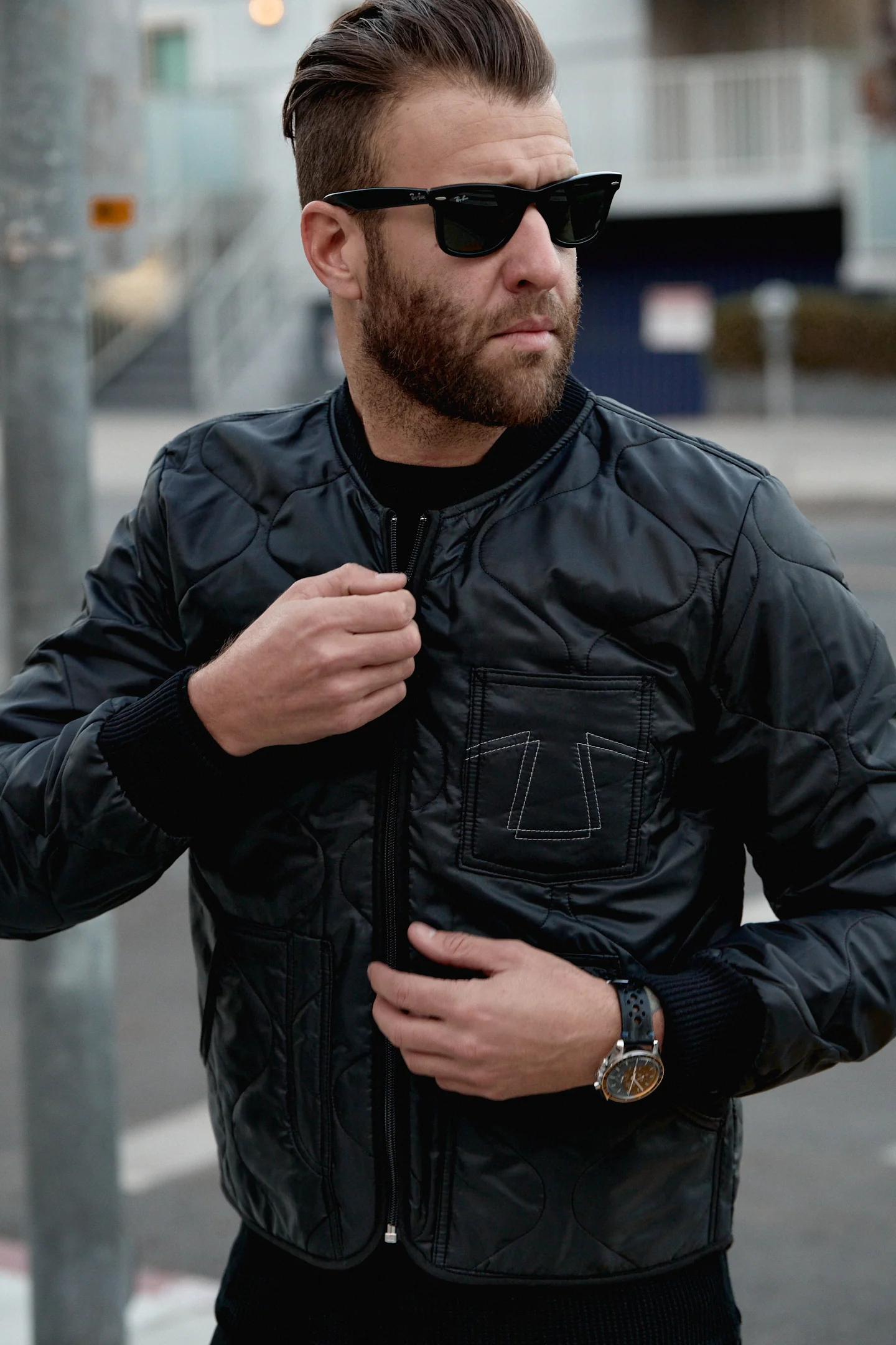 Also features a chest pocket with tonal Z-Bar stitching. Finished with ribbed cuffs and collar.