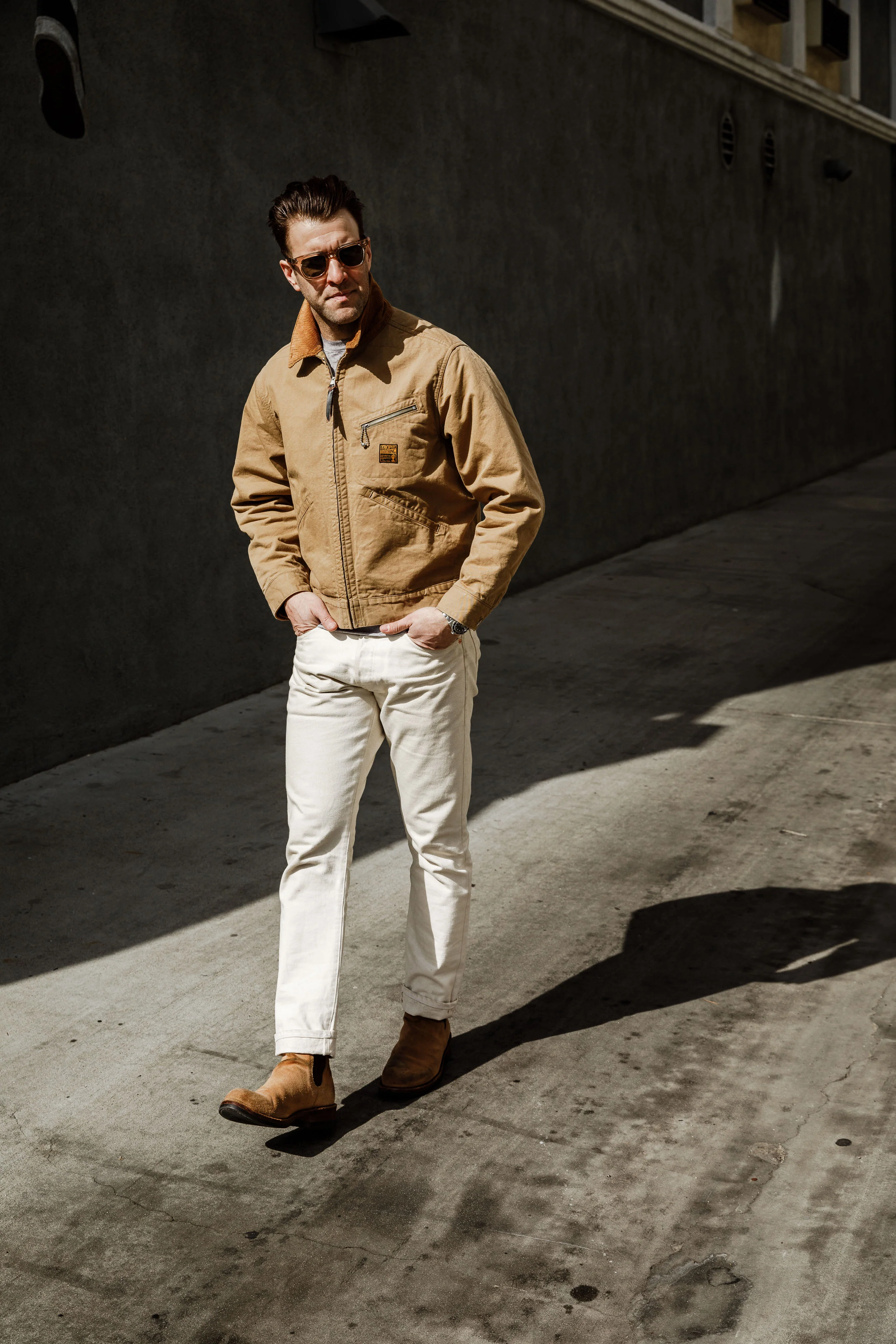 A 50s style work jacket made from yarn-dyed cotton chino with a strong twill weave.
